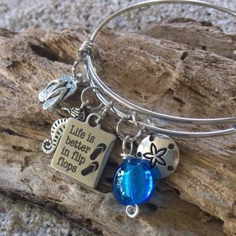 This beach bangle is inspired by the beach lifestyle we all love and wear. Who doesn't wear flip flops? The bracelet is adjustable and the charms vary, so every one is unique. Hand-crafted with love for you to wear and enjoy.