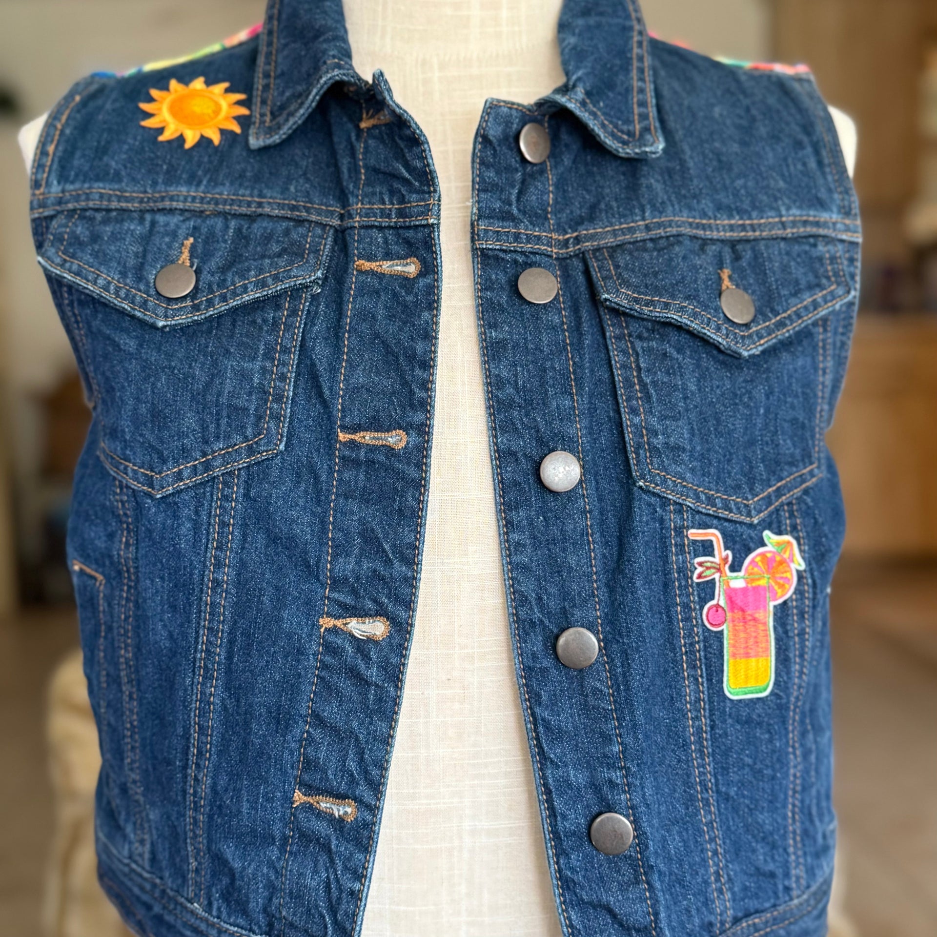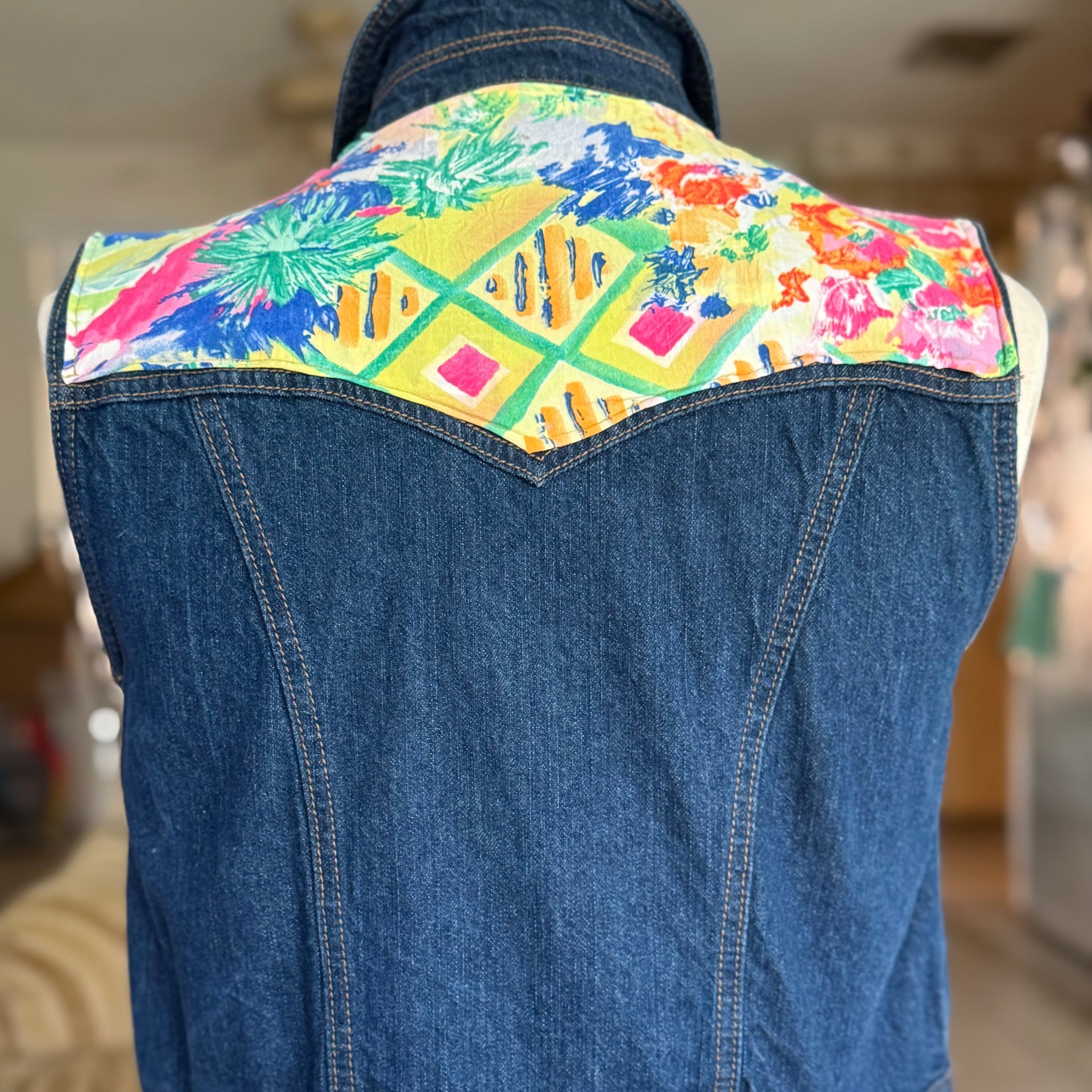 This preowned denim vest got a fresh look with tropical flair and a second life through up-cycling. It has been refashioned with colorful recycled tropical fabric by Jams World and topped off with pins. Perfect for tropical climates when you don't want to weather a jacket, but still support the tropical lifestyle and care about the environment.