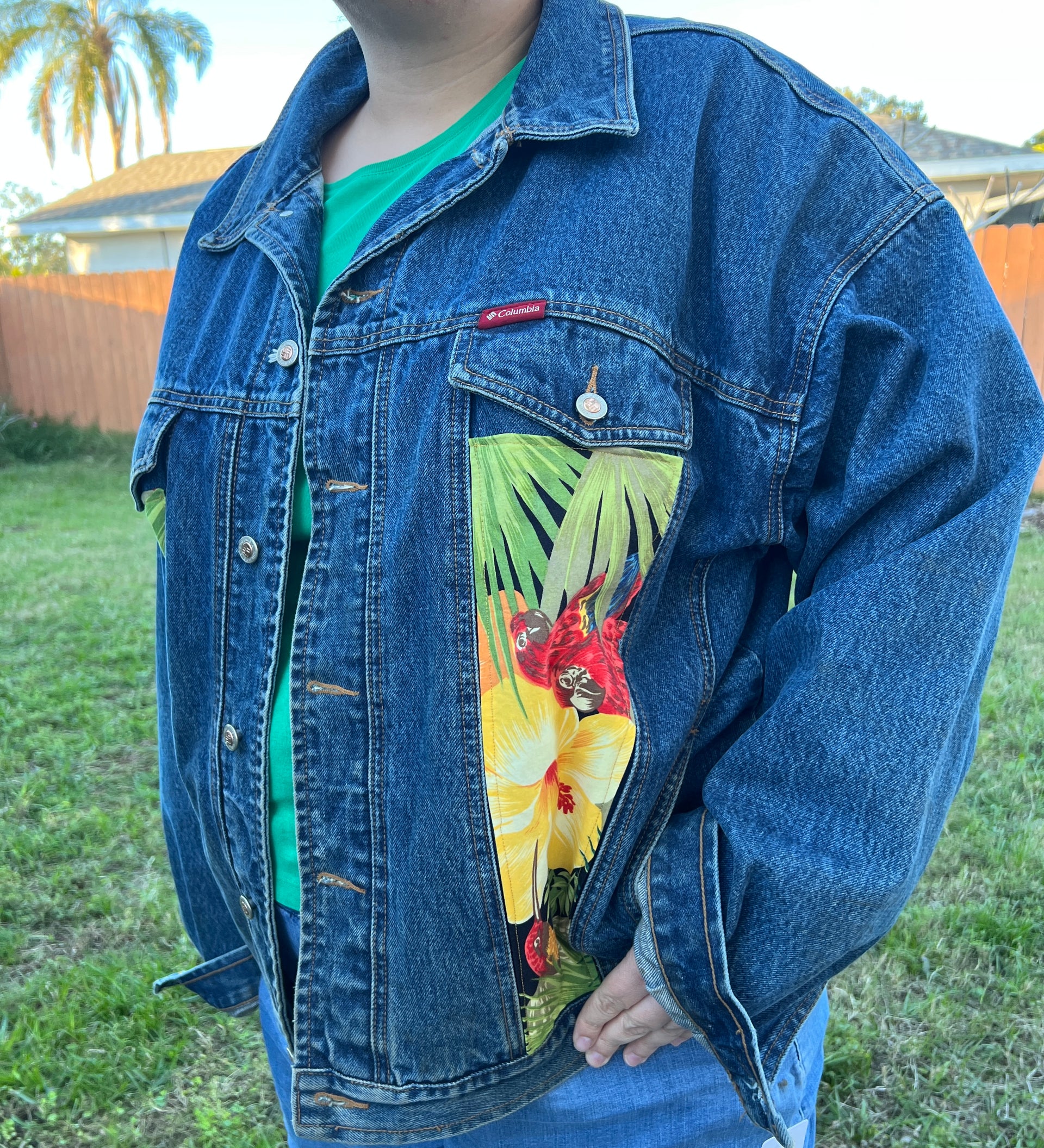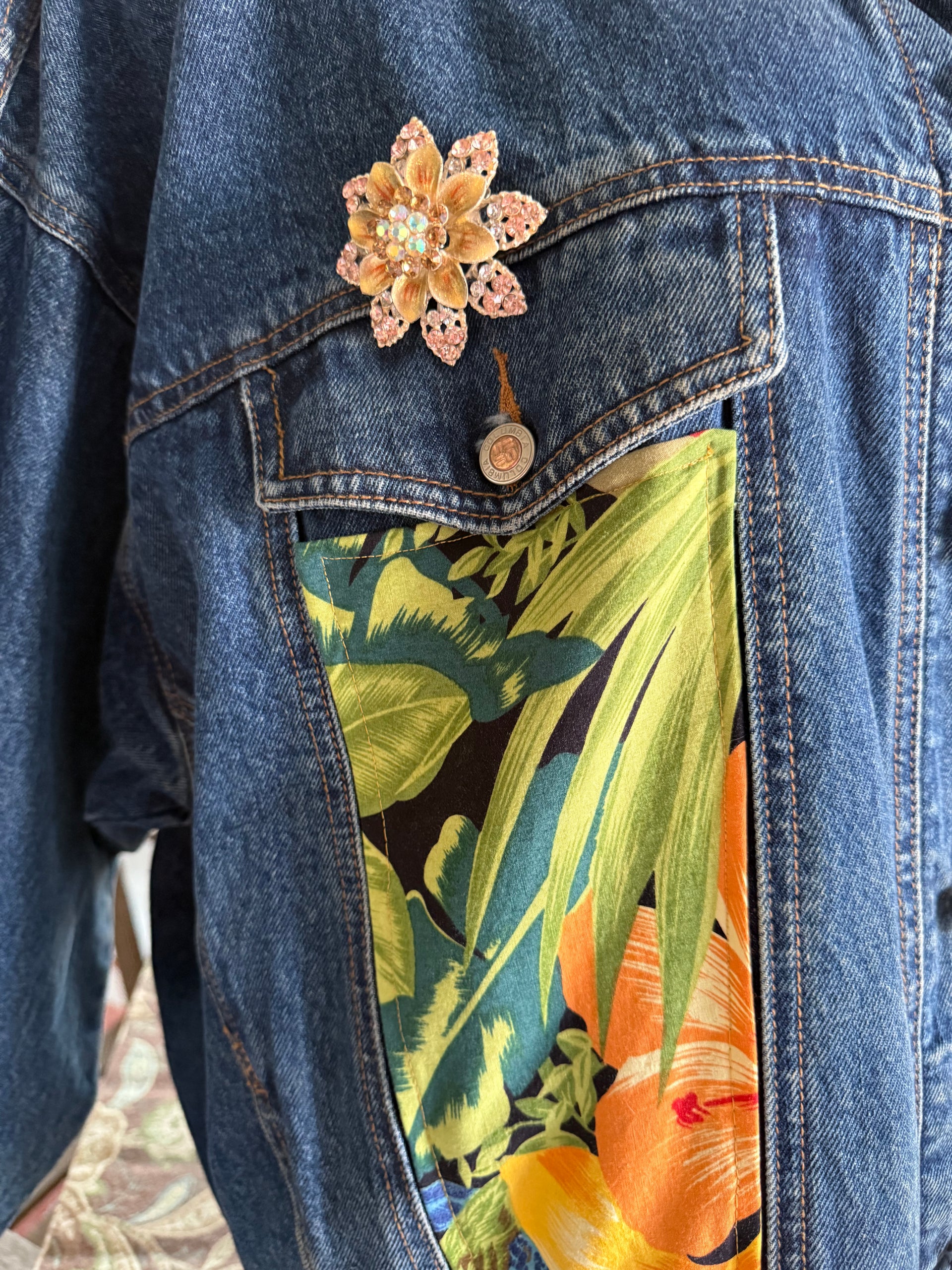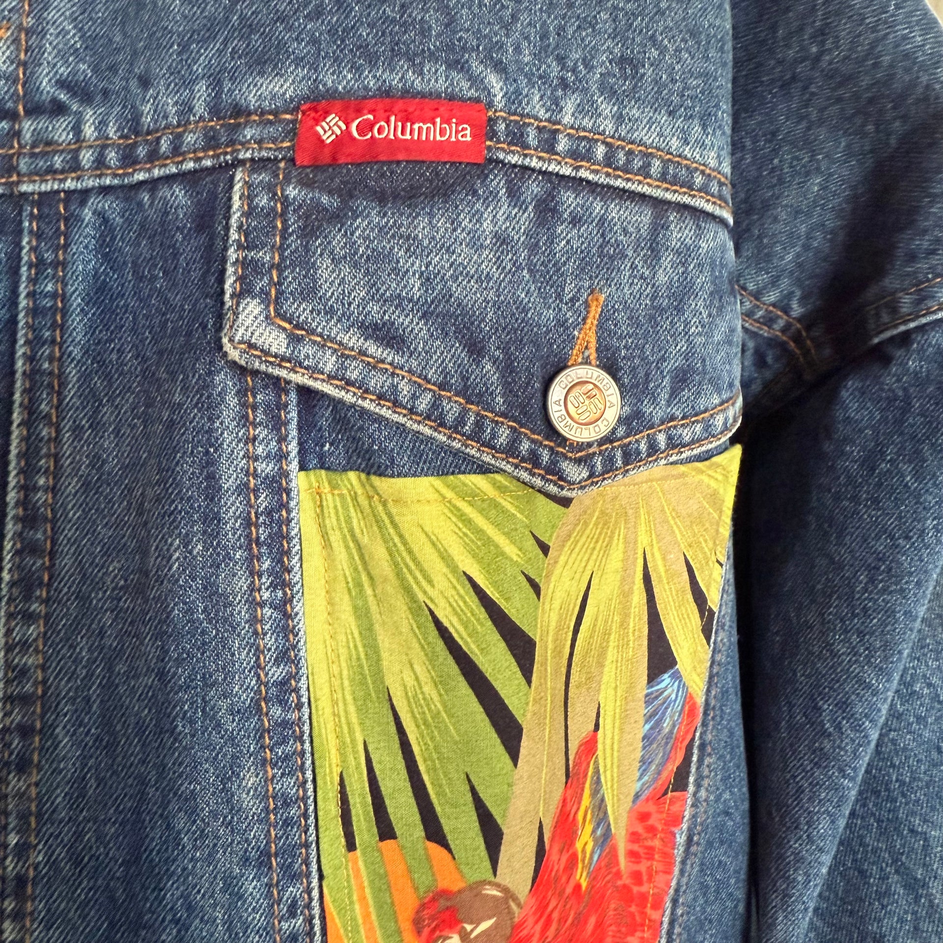 Recycle, reuse, reduce. Authentic denim is made from natural, sustainable cotton which can be reworn, refashioned and repurposed. Recycling is good for the environment, good for us! This gently-used denim jacket is restyled with vintage tropical fabric by Jams World in Hawaii. It also features a rhinestone parrot on the back.