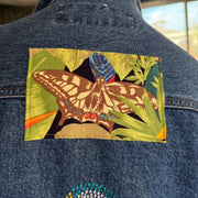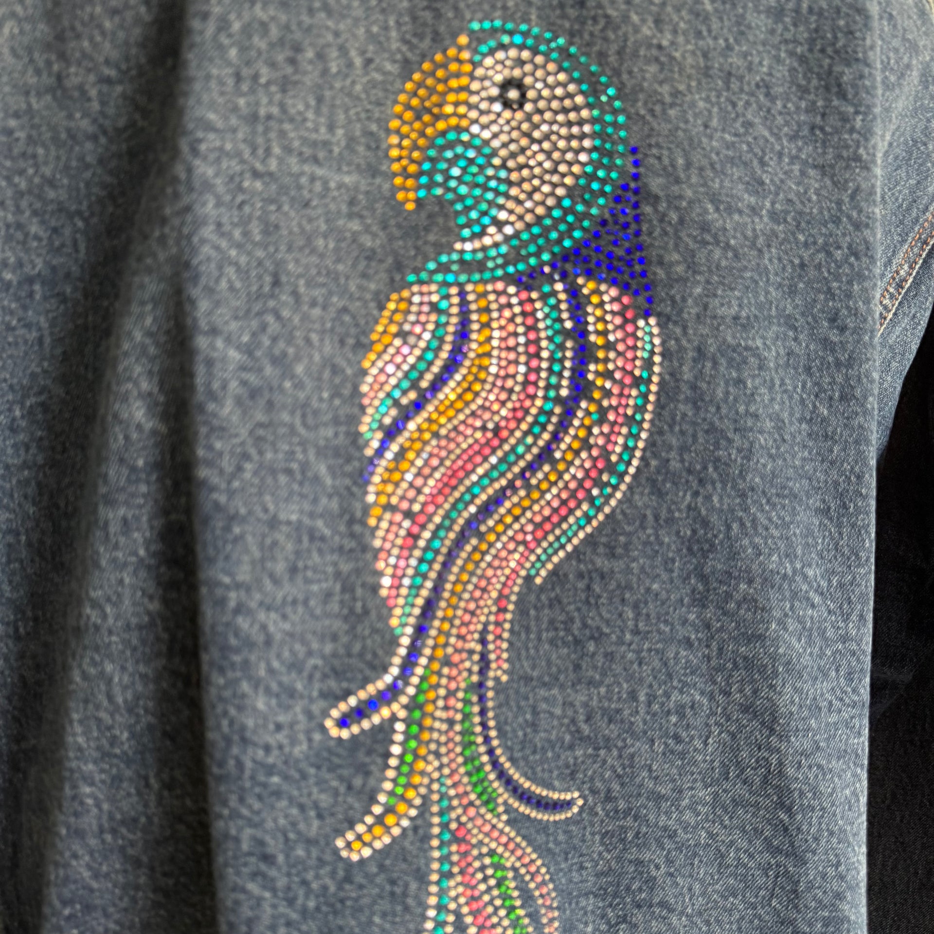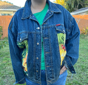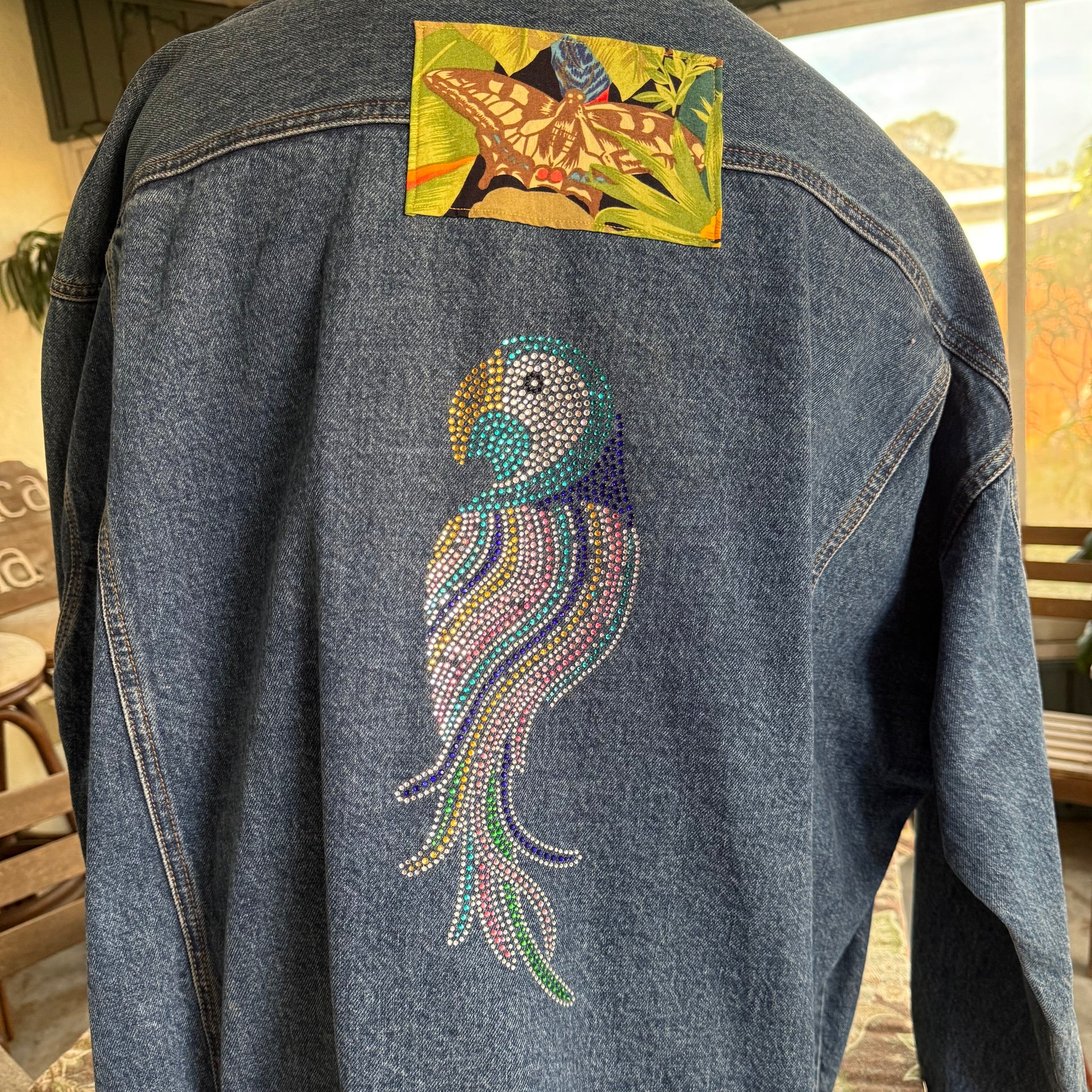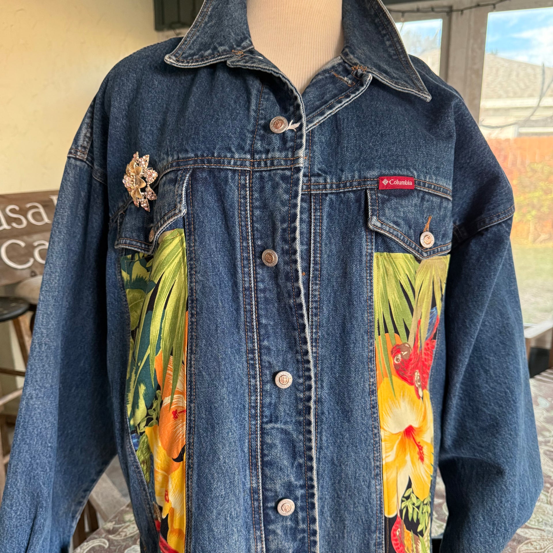 Recycle, reuse, reduce. Authentic denim is made from natural, sustainable cotton which can be reworn, refashioned and repurposed. Recycling is good for the environment, good for us! This gently-used denim jacket is restyled with vintage tropical fabric by Jams World in Hawaii. It also features a rhinestone parrot on the back.